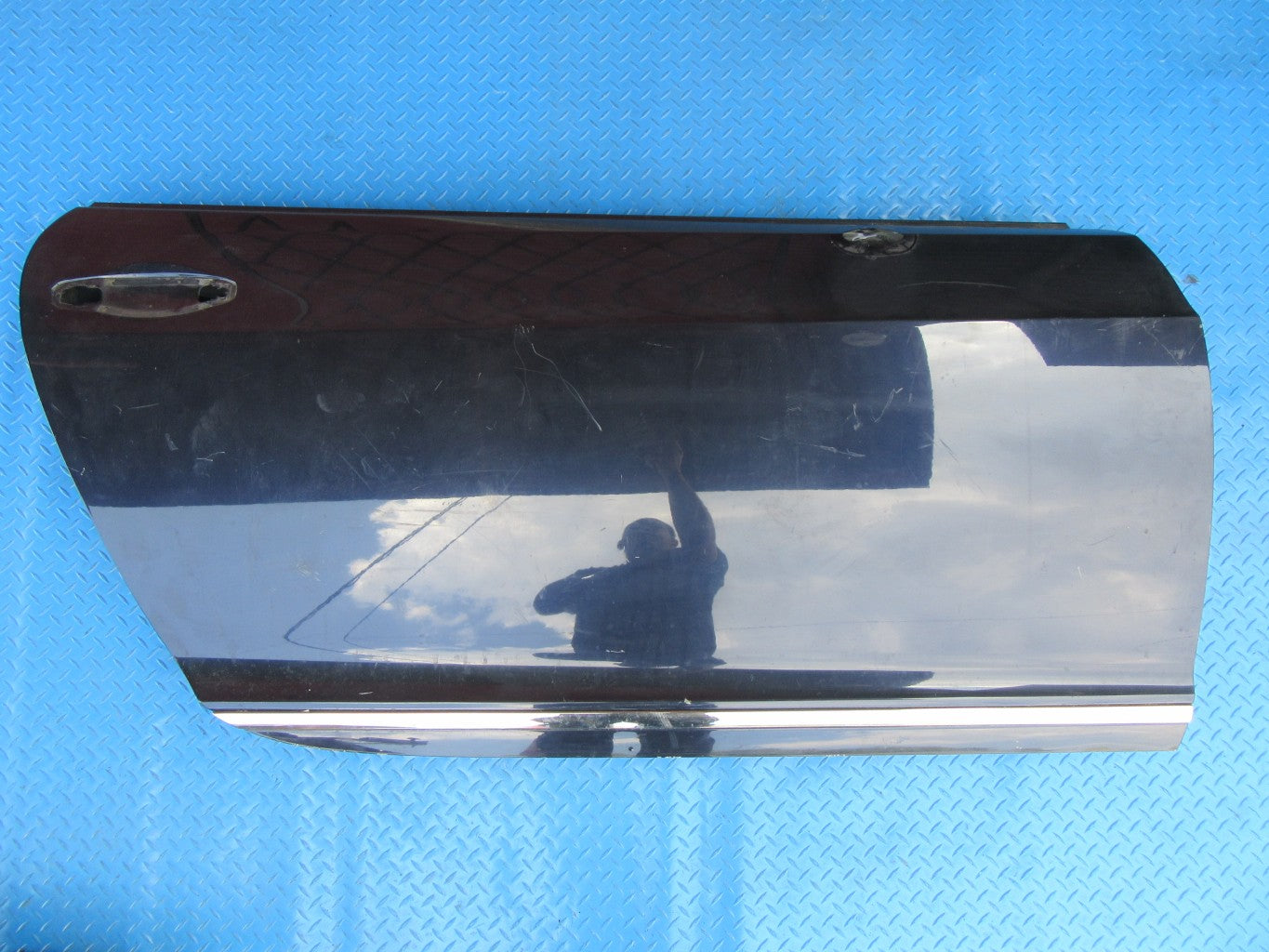 Used right front door has scratches and a dent towards the bottom by the chrome. Chrome has scratches and a dent, see pictures